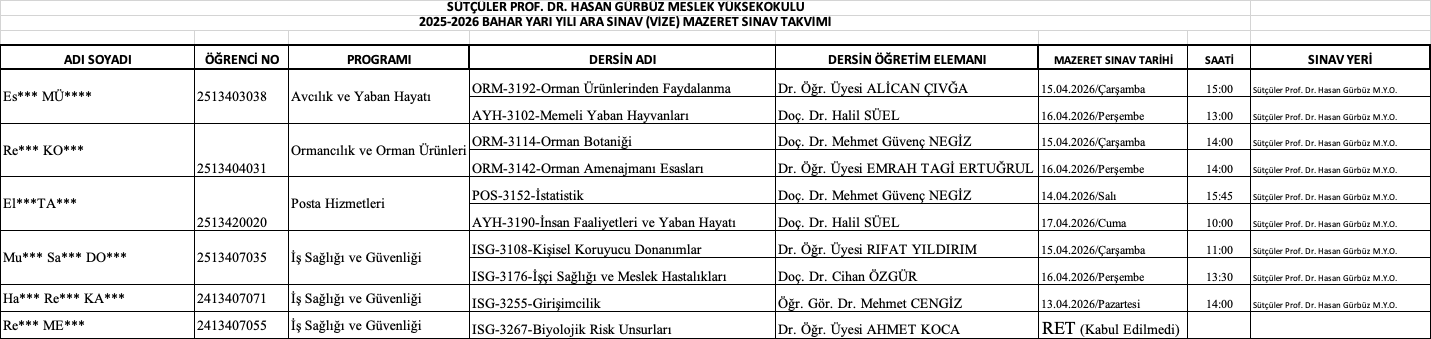 2025-2026 BAHAR YARI YILI ARA SINAV (VİZE) MAZERET SINAV TAKVİMİ